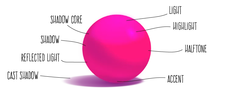 However, there’s really more than one “shadow” we’re working with here. Drawing for Dummies has a nice guide that I will summarize briefly below.